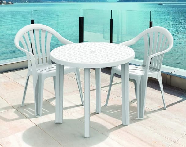 This sturdy 33.5" round plastic table is perfect for both indoor and outdoor use. Weatherproof and durable, it features a built-in umbrella holder.