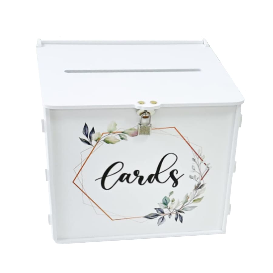 To your special day with our Wedding Card Box — perfect for collecting cards, notes, and well-wishes from your guests. Designed with a modern look, this sturdy card box features a convenient slot on top and a secure lock to keep your cards safe throughout your celebration.