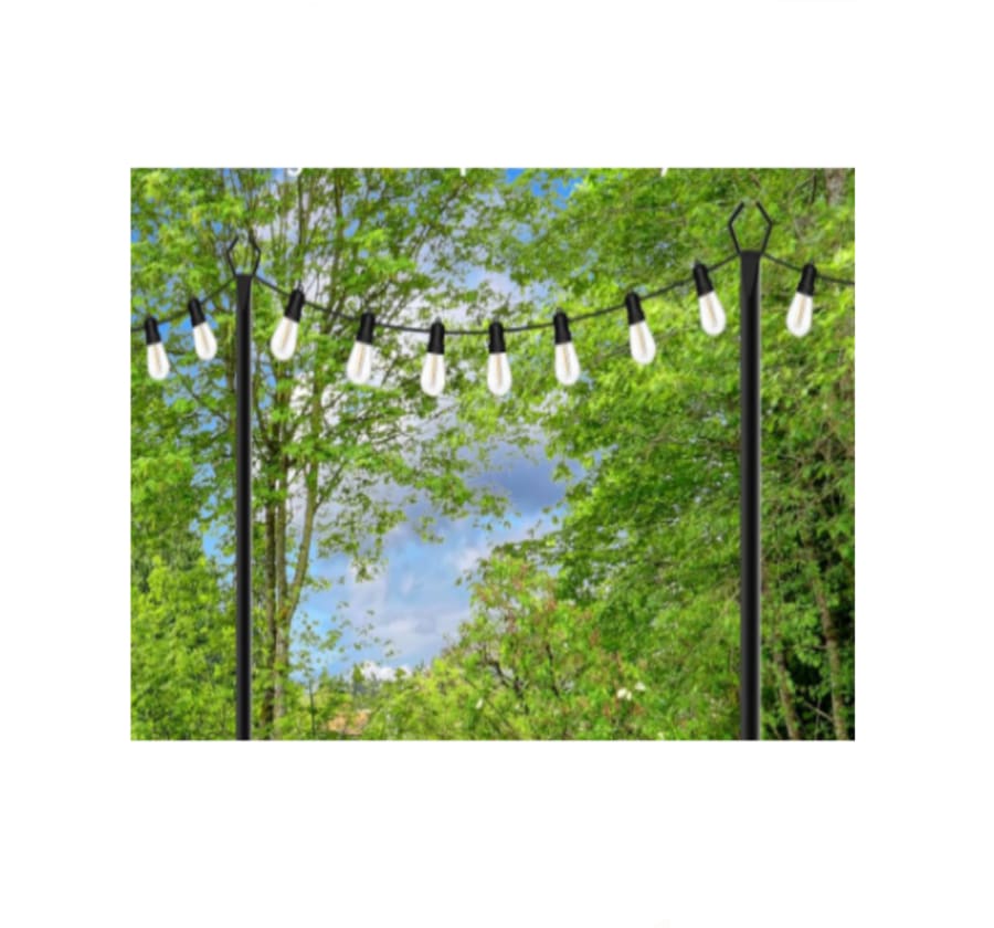 These string light poles can be used on grass with the included forks or on hard surfaces with a weighted base, let us know which you prefer.
