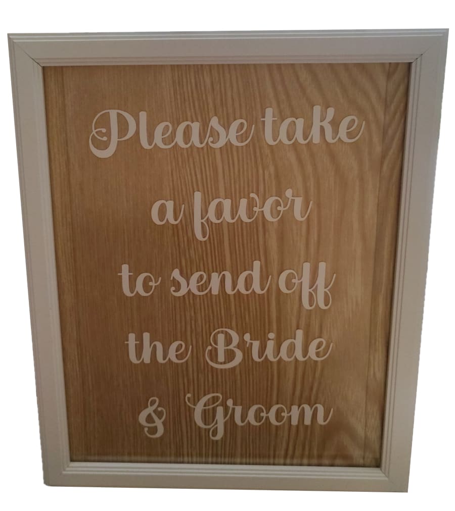 Complete your favor table with this heartfelt 8x10 “Please Take a Favor to Send Off the Bride and Groom” sign. Framed and ready to display, it’s the perfect finishing touch to show appreciation to your guests as they celebrate the happy couple.