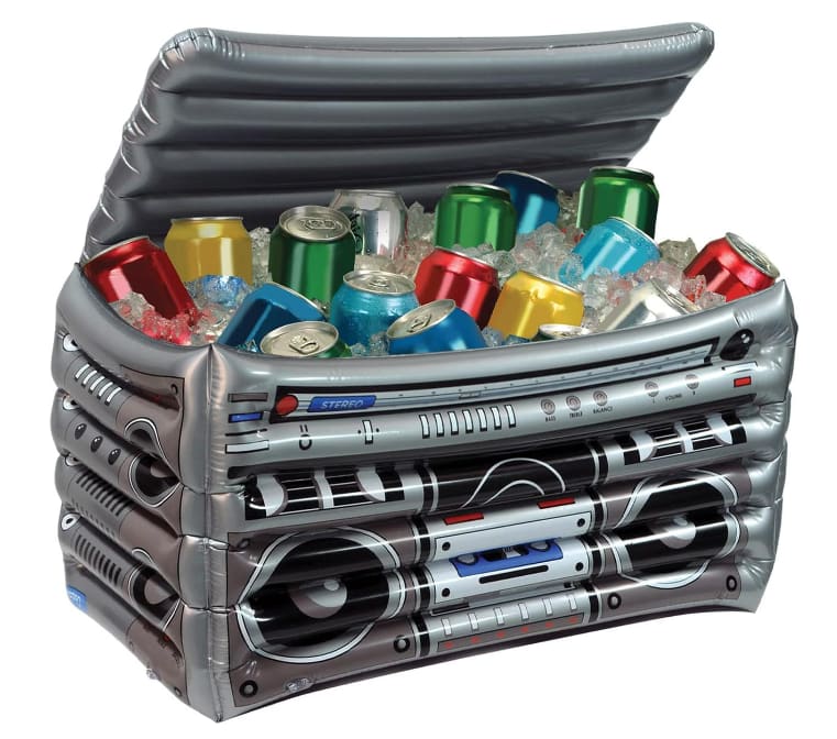 Level up your party with this retro 80s Inflatable Boom Box Cooler! It holds up to 48 twelve-ounce cans of your favorite drinks, fill with ice and keep the cool vibes going all night!