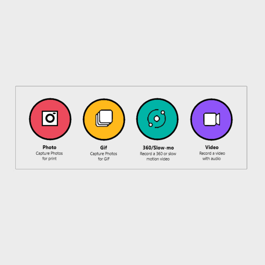 Our photobooth can be set up to capture traditional still photos, animated GIFs, playful Boomerangs, or even short video messages. Choose one or offer multiple experiences to keep the excitement going.