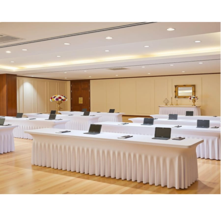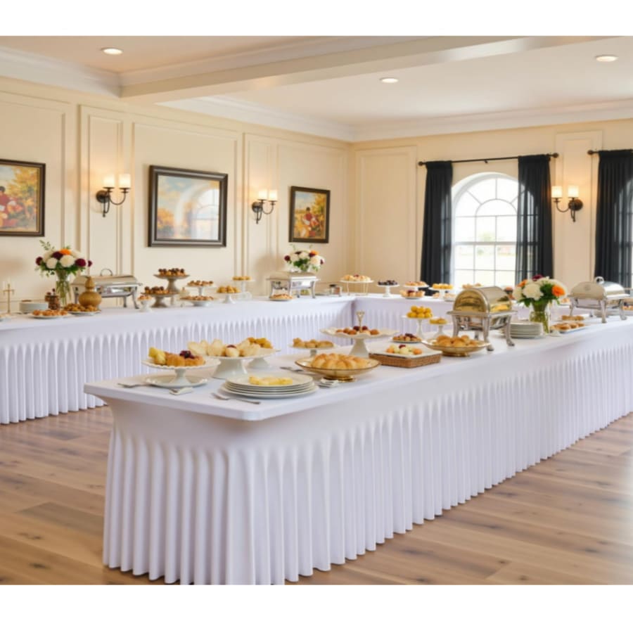 Elevate your event setup with our 6FT white pleated spandex tablecloth, designed to fit standard 6-foot rectangular tables (72” x 30”). Made from high-quality stretch spandex, this fitted table cover provides a sleek, wrinkle-resistant finish while adding elegant, pleated detailing for a polished look.