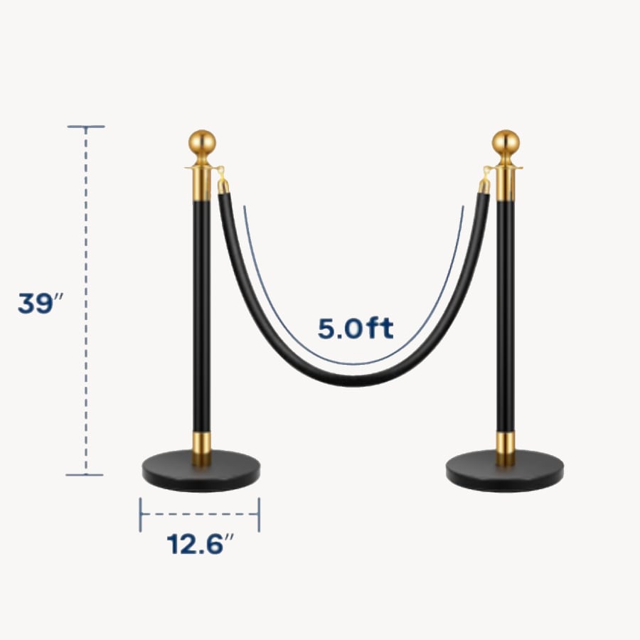Rental includes: Two black and gold stainless steel stanchion posts with one black velvet rope. Prefer red velvet rope instead? Just let us know in the notes section during booking—no extra charge.