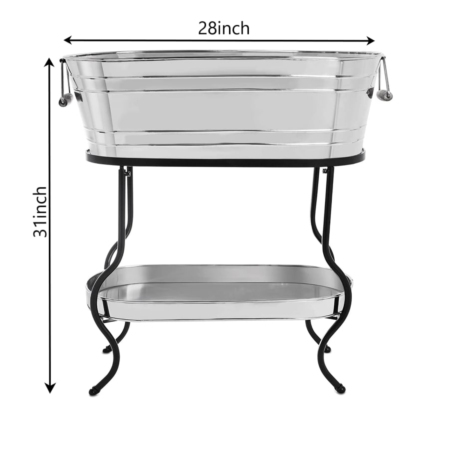 The removable tub sits on a sleek metal stand that raises it to a comfortable height, helping guests serve themselves without bending over. A built-in drip tray catches condensation to protect surfaces, while the bottom tray offers extra storage for backup drinks or party essentials.