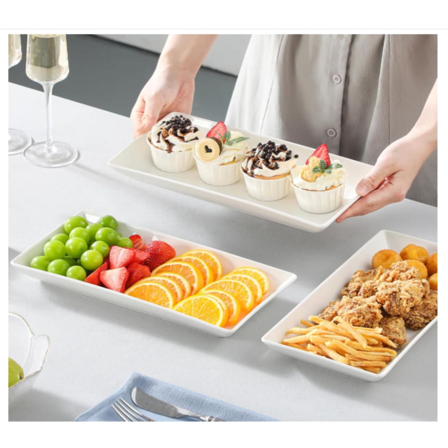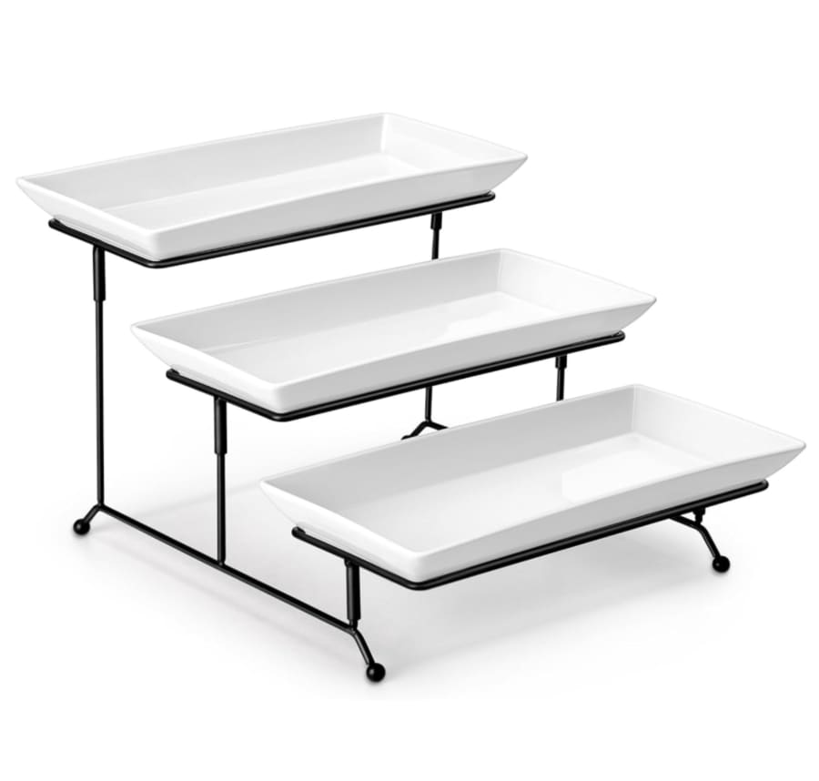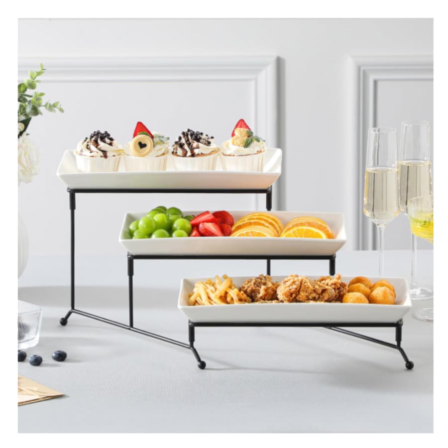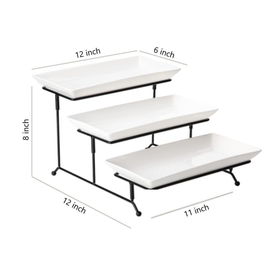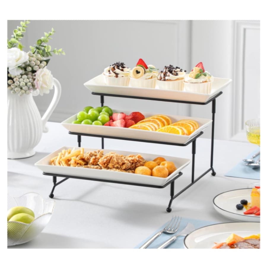 Elevate your dessert and buffet display with our 3-tier serving tray. Featuring three 12” rectangular white porcelain platters and a sturdy metal stand, this tiered display is perfect for showcasing desserts, cupcakes, pastries, fruit, and appetizers at weddings, parties, and special events. The collapsible, height-adjustable design allows for easy setup. These trays are food-grade, dishwasher-safe, microwave-safe, and oven-safe. Stylish, stable, and functional—this serving stand is an elegant addition to dessert tables, buffets, and holiday gatherings.