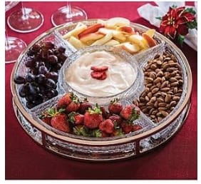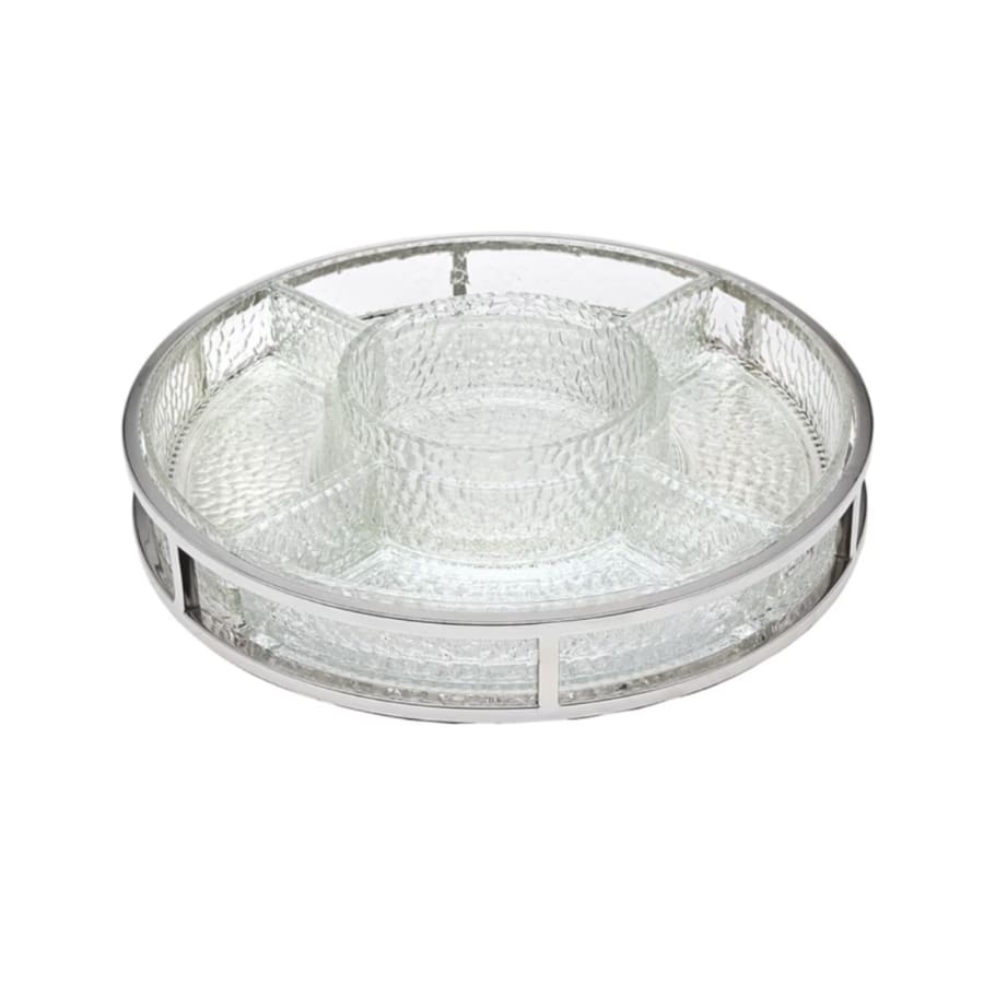 Serve in style with this versatile 6-piece set, perfect for elegant gatherings. Featuring 4 lead-free hammered crystal servers, one center bowl and a nickel-plated metal tray, this 2-in-1 design lets you serve appetizers, desserts, or drinks with ease.