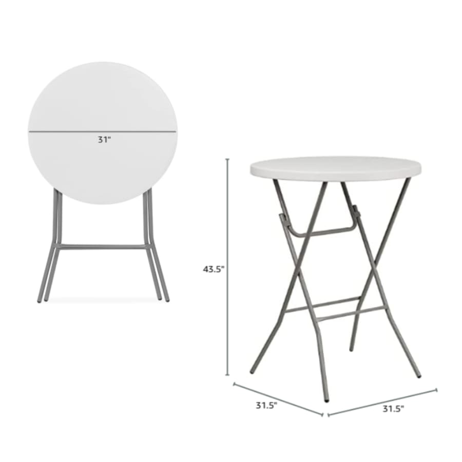 Measurements: 31" L x 31" W x 43.5" H Max Weight: 165 lb Seating Capacity: 3 guests Tablecloth Recommendation: Spandex Cover available in white or black