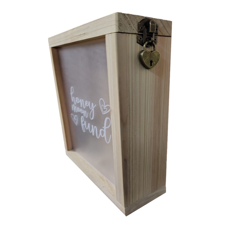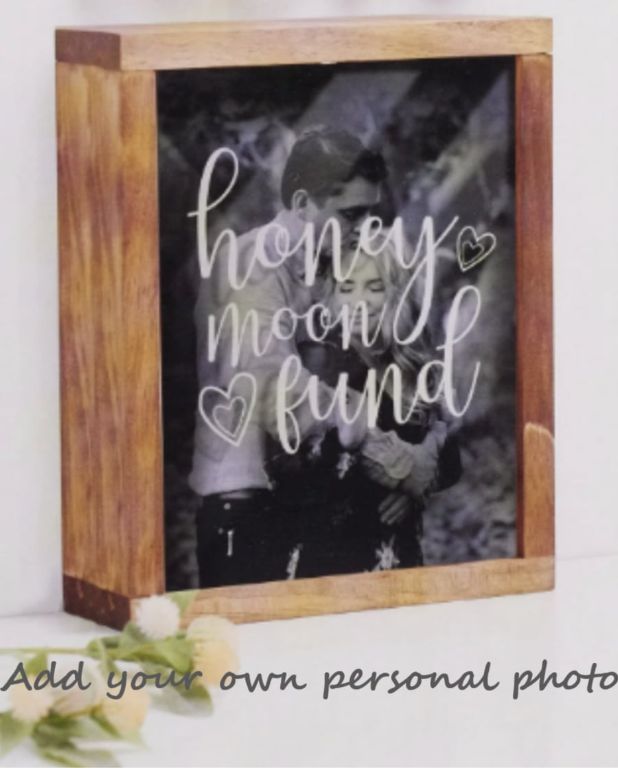Add a charming touch to your wedding décor with our Honeymoon Fund Box. This decorative box allows you to remove the top and insert a 7"W x 9"H personal photo, creating a heartfelt and memorable display. It can also be used without a photo for a clear, transparent display option. Add it to your gift table, this box offers a stylish way for guests to contribute to the couple’s honeymoon fund.