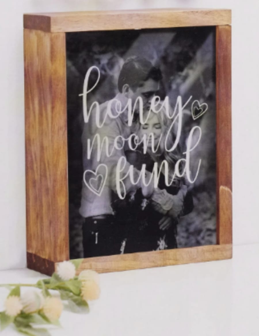 Add a charming touch to your wedding décor with our Celebrate Honeymoon Fund Box — a beautifully crafted keepsake made from durable medium-density fiberboard in a warm brown finish. This decorative box allows you to remove the top and insert a personal photo, creating a heartfelt and memorable display.