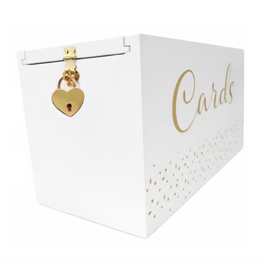 Add an elegant touch to your celebration with our White and Gold Cardholder Box. This beautiful box features a convenient sliding lid with lock and card slot, making it easy for guests to drop their cards, notes, or well wishes.