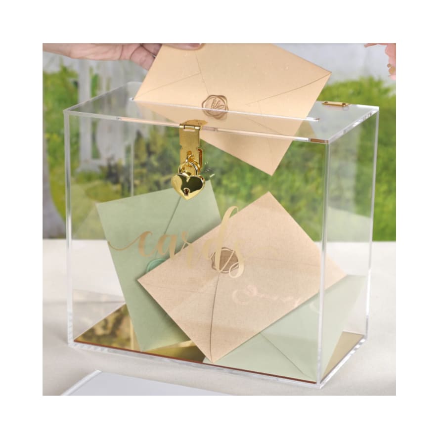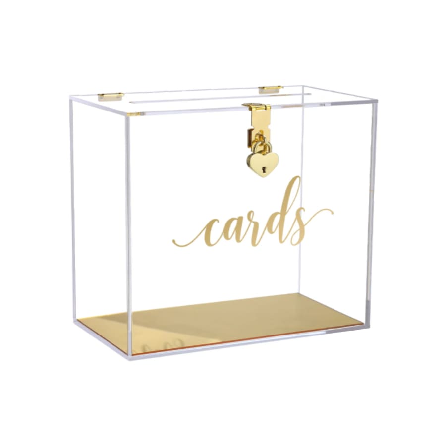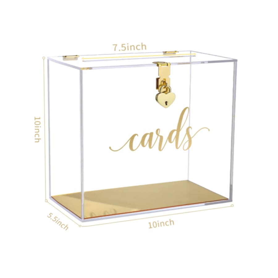Add a modern, elegant touch to your event with our crystal-clear acrylic card box, featuring a gold foil “Cards” design, mirrored gold base, and heart-shaped lock with keys. This sturdy box offers ample space for up to 100 cards. The flip-top lid and secure lock make it both stylish and functional — a beautiful way to collect cards, cash, or small gifts at your celebration.