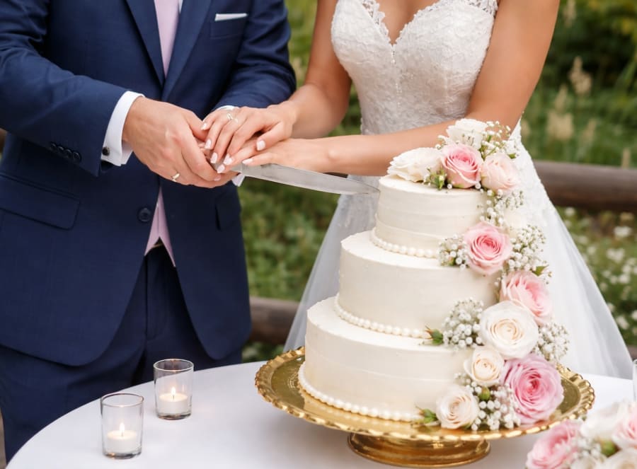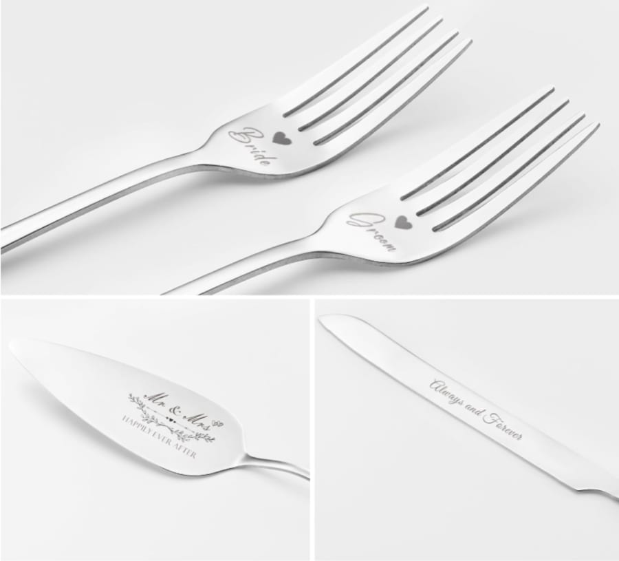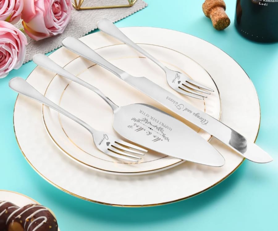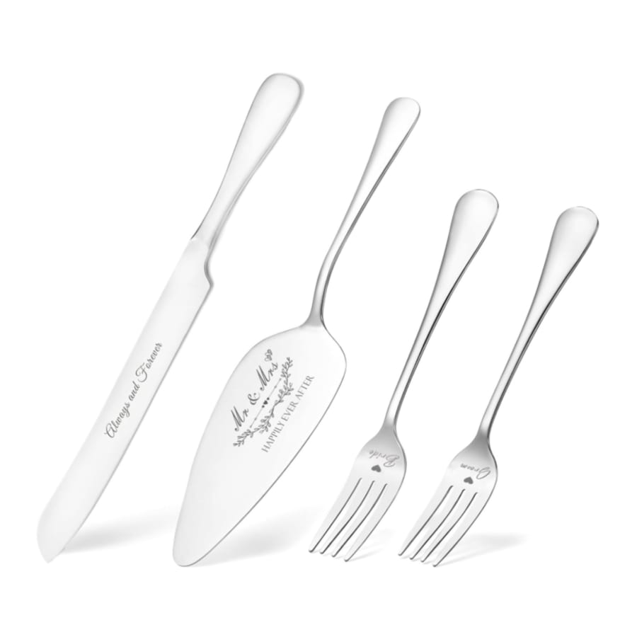 Add a timeless touch to your celebration with this elegant wedding cake cutting set. This set includes a stainless-steel cake knife and server, beautifully engraved with romantic phrases, plus matching forks for the bride and groom.