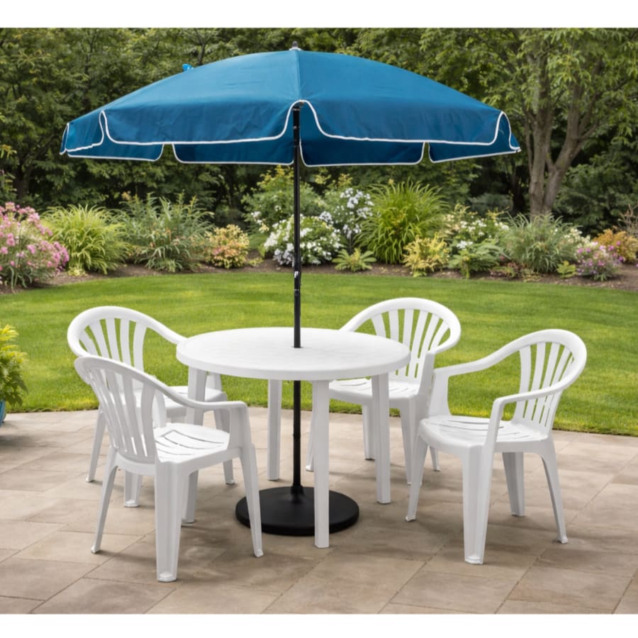 Setup & Teardown: Included Customer Pickup: Not available – delivery required Bundle Includes: One round white plastic table, 4 sturdy white plastic chairs, one blue patio umbrella, and one Black heavy-duty steel umbrella base (7) pieces total Product Disclaimer: Images are for reference only. Actual items may vary in appearance. Colors may differ slightly due to lighting and screen settings. Styling and décor shown are for inspiration only and may not be included. Minor variations and normal wear may be present.