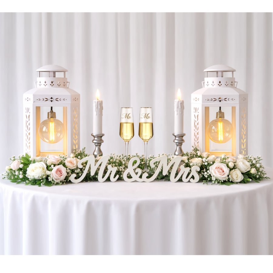 Create a romantic focal point for the newlyweds with our Sweetheart Table Decor Bundle. This package includes elegant lanterns, candles, a Mr. & Mrs. sign, and a pair of champagne flutes for the couple’s celebratory toast. Perfect for adding a beautiful finishing touch to the couple’s table.